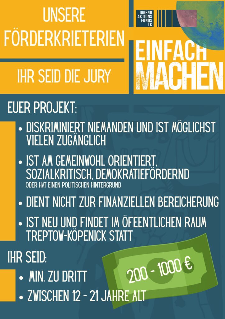 Mail: jugendaktionsfonds@kjbb-tk.de / WhatsApp/Signal: +49 15256200867 / Insta: Einfach Machen!